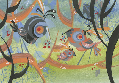 This'll be up for sale to benefit the Cartoon Art Museum. It's some birdsh. Dey gots some berriesh. Birdsh gotta eat, too.